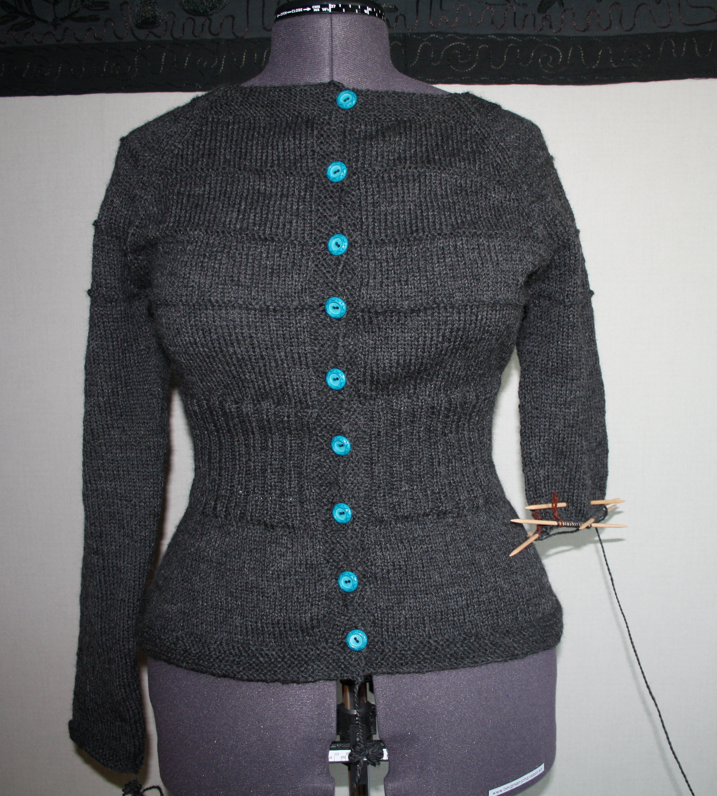 Den här koftan stickas ju uppifrån och ner och man kan prova lite när som under produktionen. Jag har repat upp några partier: Först nederkanten som blev lite flärpig och så längst ner på ärmen som blev lite för lång (trots att jag mätte en massa). Jag är hittills väldigt nöjd och har lite pill kvar att göra. Jag tror absolut att den kommer bli ett bra tillskott till höstgarderoben (som jag under de senaste veckorna dessutom utökat med tre par brallor, men mer om dem senare).