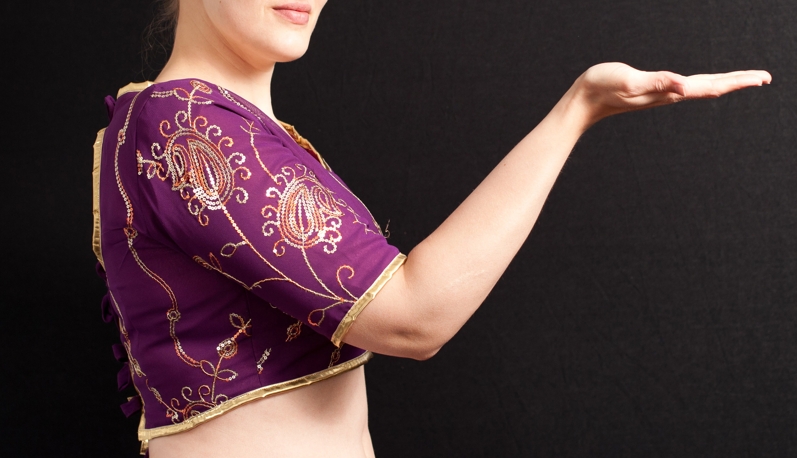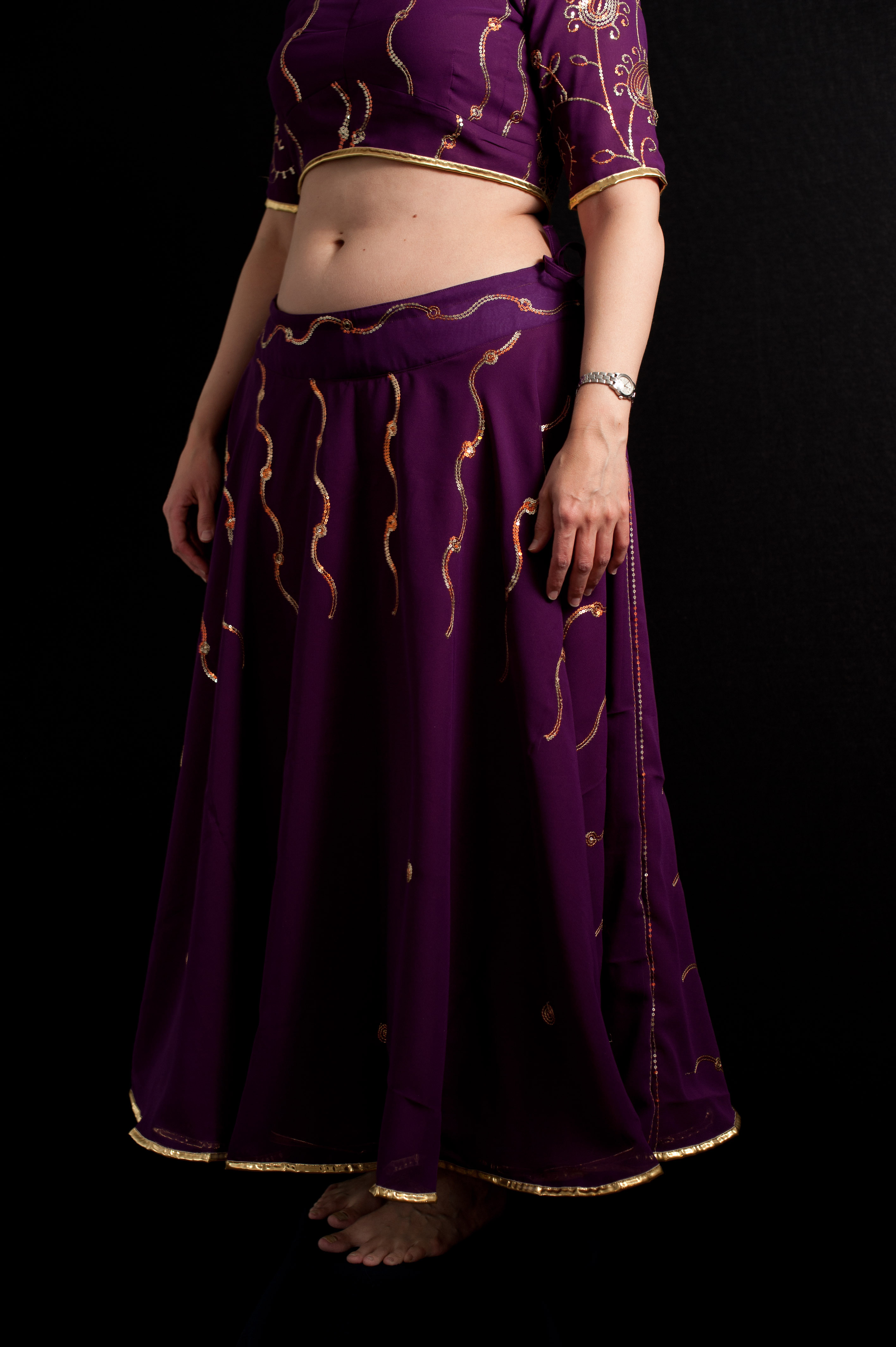 Sommarens bollyprojekt övergick i ett sensommarprojekt och nu har min lila dräkt varit klar länge. Kjolen blev klar först och därefter tog toppen form. Ms A och jag har fixat allt när vi har haft systuga under sommaren och tidiga hösten; allt klipptes till i juli och har sedan satts ihop efter som. Kjolen är dubbel med guldband längst ner och en svängd midja för att passa bättre mot kroppen (åtminstone min…). Underkjolen gjorde jag av min träningskjol som gått under beteckningen helvetestygskjolen (mindre samarbetsvillig i tilljämningsstadiet; jag stod 1,5 timme snurrandes på en stol i januari medans mammi jämnade till den bit för bit. Tyget betedde sig underligt och resultatet blev inte optimalt, trots erfarenhet och ihärdighet). Jag fick t.o.m. till dragkedjan riktigt bra! Jag kan tacka min tips-och-tricks-bok i allmän sömnad samt egna funderingar för det! Den svängda midjan har jag ritat av från en annan kjol som jag tyckte passade bra. Cholins delar är utklippta separat i yttertyg och fodertyg, tygstyckena nålades sedan ihop och sicksackades ihop, och efter det kan man börja sy ihop cholin på riktigt. Det tar ett tag eftersom man måste nåla noga för att det slinkiga tyget inte ska fara runt när man sicksackar ihop dem…