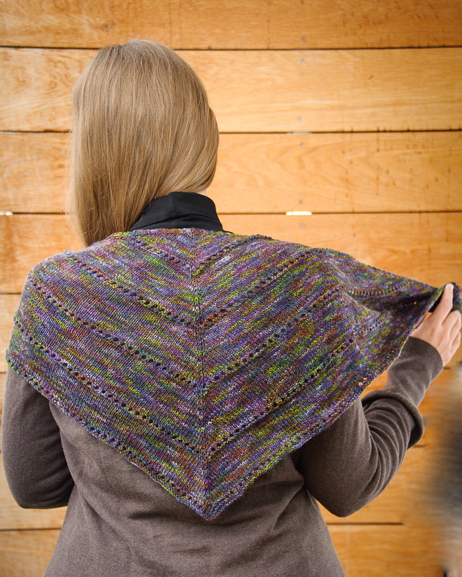 Mönstret jag har använt heter The age of brass and steam kerchief (gratismönster på Ravelry). Egentligen ska man ha tjockare garn, men det är ju ett väldigt basic mönster som inte precis är storleksberoende. Min gissning visade sig stämma; det passar bra till den här typen av olikfärgat garn! Jag har inte stickat med sådant garn förut; de olikfärgade garnerna jag hittills har använt har haft långa färgpartier som sedan övergår i en ny färg. Det här garnet var mer färgat ”på tvären” vilket ger en mer melerad effekt. Snyggt i mina ögon! Och nu när det börjar bli kallt igen passar det extra bra med en liten stickad och mjuk sak runt halsen under jackan. Har också insett att det är dax att gå ner i källaren och hämta upp mössorna… Men först: röja köksbord och klippa till bralla!