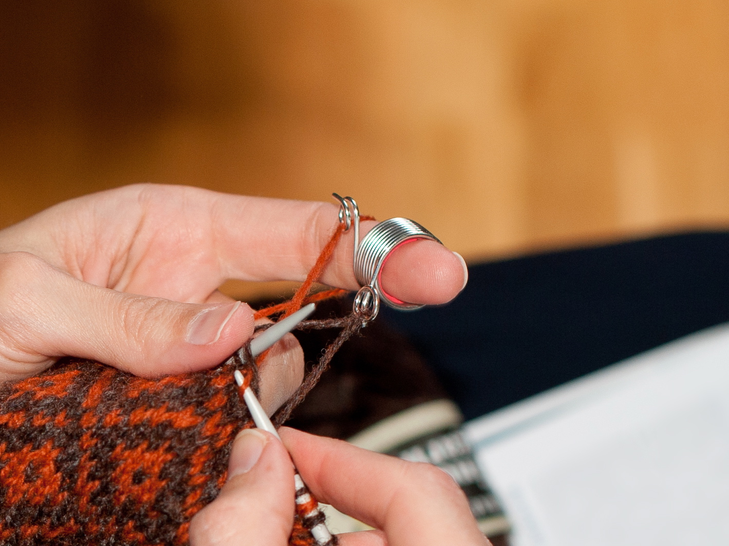Jag håller med Kate; jag tycker att den här stickfingerborgen funkar bra, efter att jag har moddat den lite med delar av ett brett gummiband på insidan för att få den att sitta fast på fingret. Den separerar garnerna bra och det är lätt att plocka rätt tråd. Dock tror jag inte den lämpar sig för projekt där det är långa partier i en färg där trådarna måste bindas om varandra; är det däremot en tydlig basfärg och bara mönsterfärgstråden som måste bindas funkar det bra. Men allra bäst när det är korta rapporter.