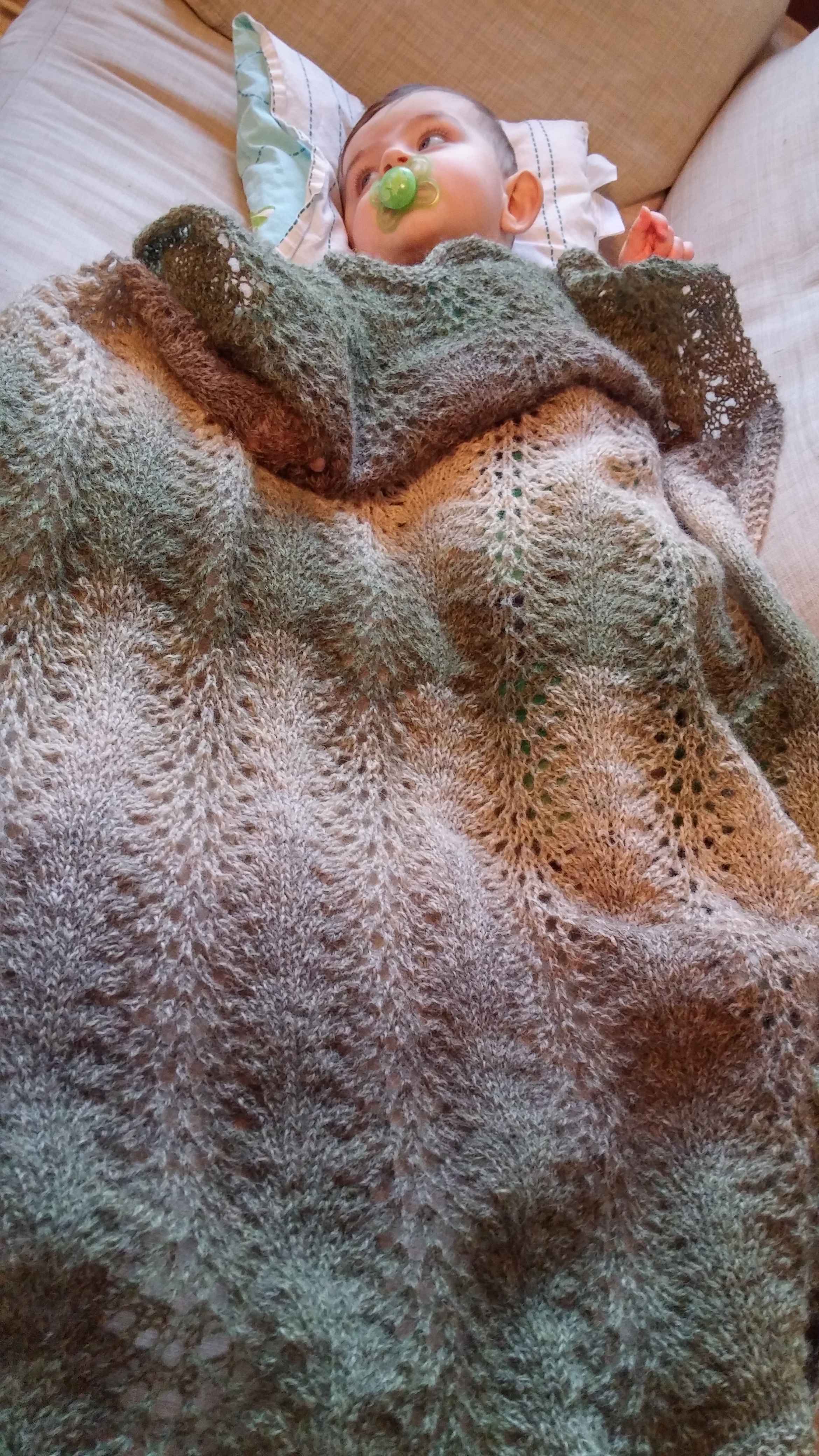 Ullcentrums tvåtrådiga är ju ett av mina favoritgarner och det är en tjusig färgkombo med grönt-grått-vitt. Själva stickningen var väldigt repetitiv, mönstret gick snabbt att lära sig utantill och är en variant av feather & fan-mönstret. Filten är alltså tunn och luftig. Mönstret är tjusigt och lämpar sig bra för social stickning eftersom det är rakt och bara att mata på; prat är inga problem och inte heller film-tittande. Som tack för filten blev vi bjudna på smarrig middag med lika smarrig dryck till. Mums och tack för maten!