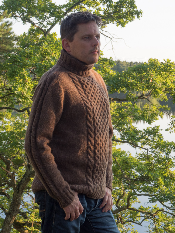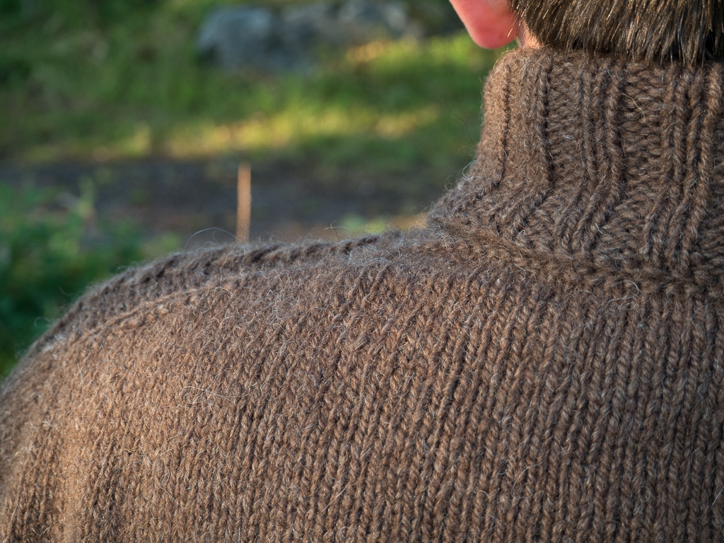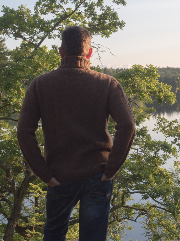 Så detta är en tröja jag har designat för att passa på Jesper och jag har gjort provlappar, jag har måttat och jag har läst i ett antal olika källor om hur jag ska forma ärmkullar och ärmhål och sedan kokat ihop nåt som faktiskt funkade rätt bra. Perfekt vore ju att ta i, men det blev åtminstone som tänkt. Ärmarna blev lite för vida uppe över ärmkullen, men inte så det stör alltför mycket (inte bäraren heller).