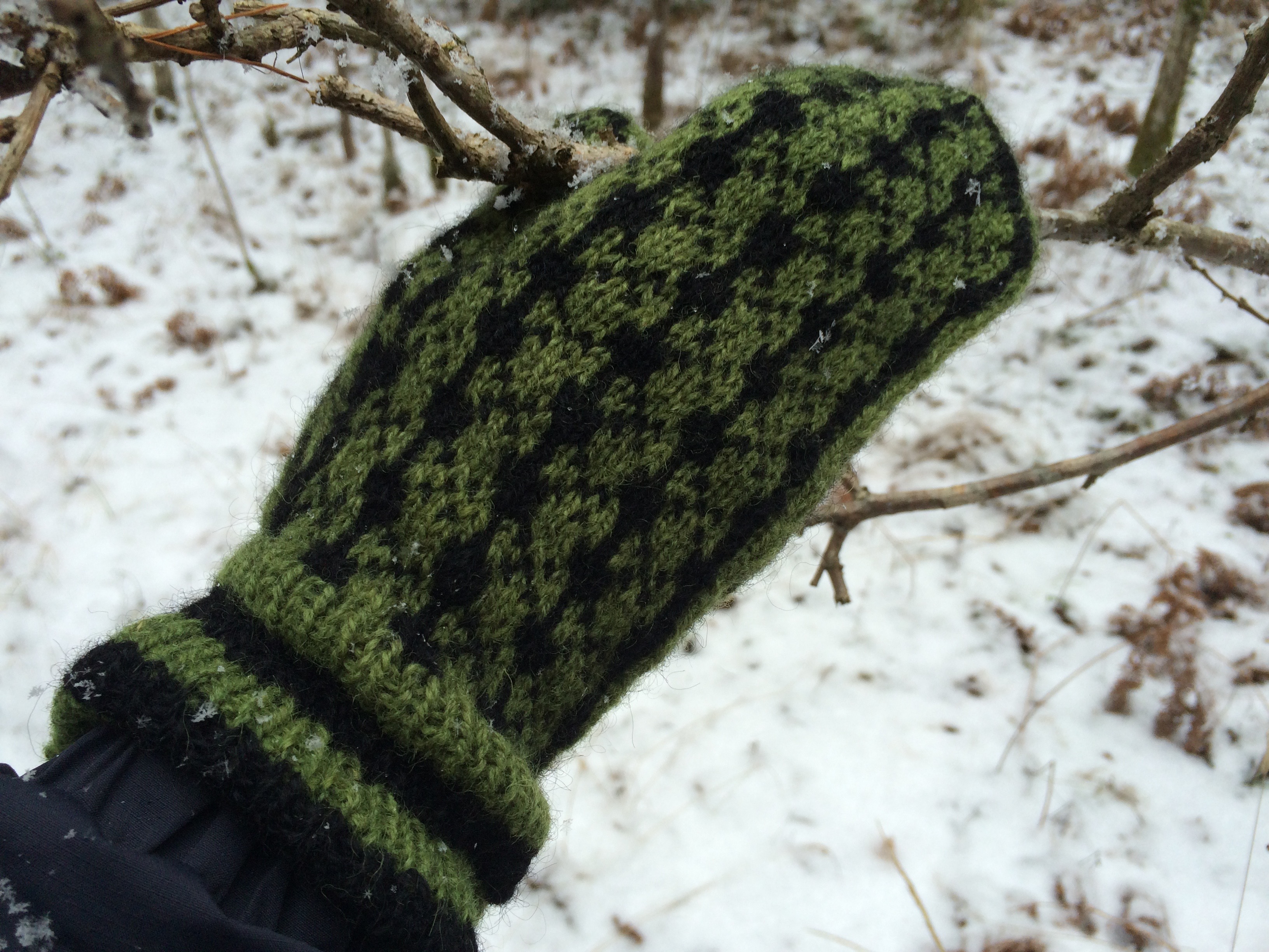 I det här fallet struntade jag i masktätheten och körde på känn. Det är ingen katastrof i det här fallet (en småmönstrad vante hade jag ändå kunnat få ihop vettigt i fingertoppen om den stickats som vanligt). Jag gjorde dock en sak jag inte kommer göra om och det är att sticka samma mönster på vantkroppen och tummen. Detta gjorde att jag var tvungen att göra vantkroppen lite för lång. Så nästa gång blir det ett avvikande men matchande mönster på tummen.