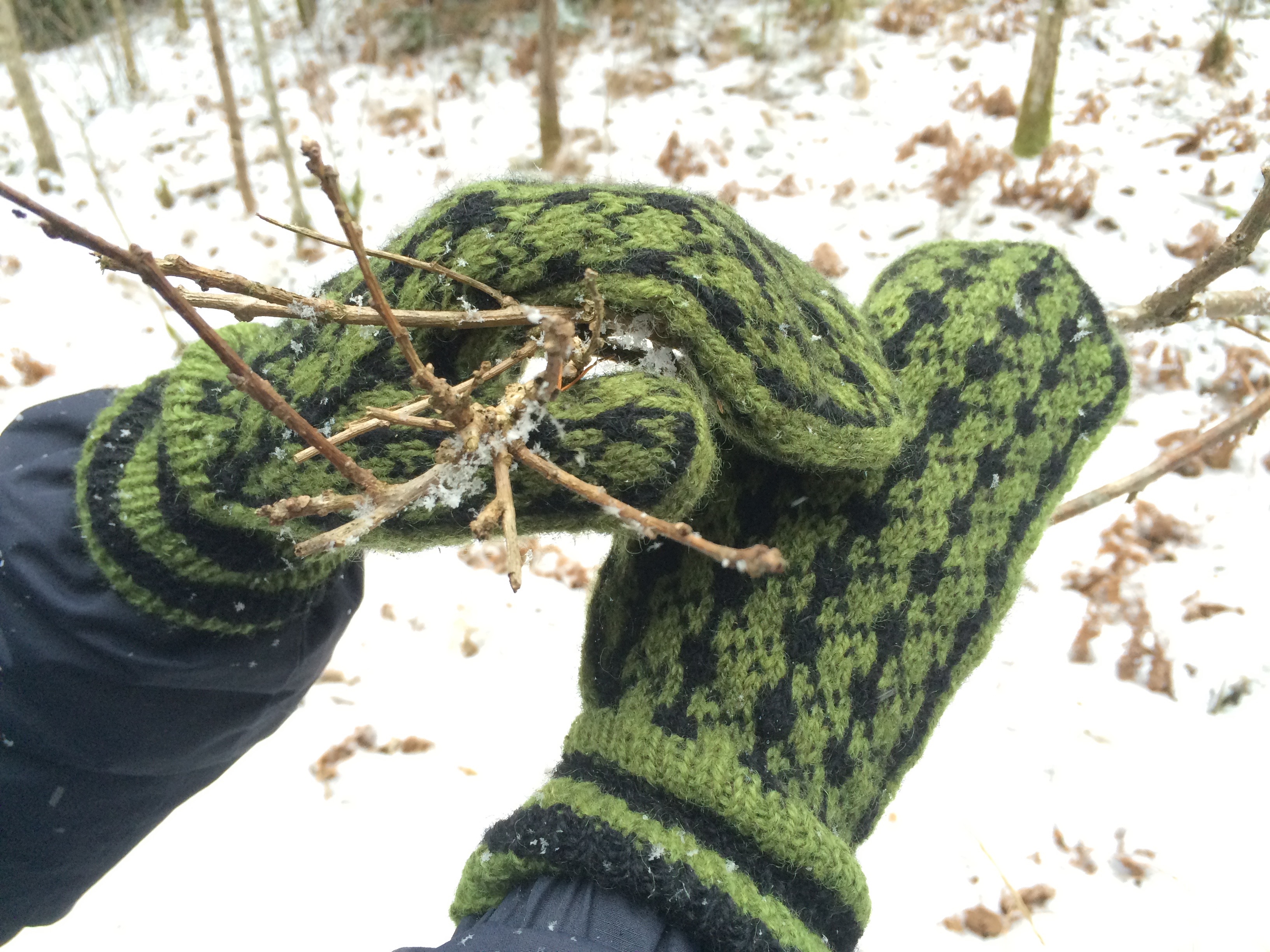Så, här kommer ett par lite knackigt ljussatta vantar som fotades under senaste vändan ute i stugan (vår stuga, yay!) nu under ledigheten efter nyår. Det är ett par vantar från Magnificent mittens av Anna Zilboorg. Det är vantar 4-13 men utan den enorma manschetten som finns i mönstret. Jag föredrar vantar som sitter åt om handleden; det funkar bäst med både mina jackor/kappor och frusna händer/handleder.
