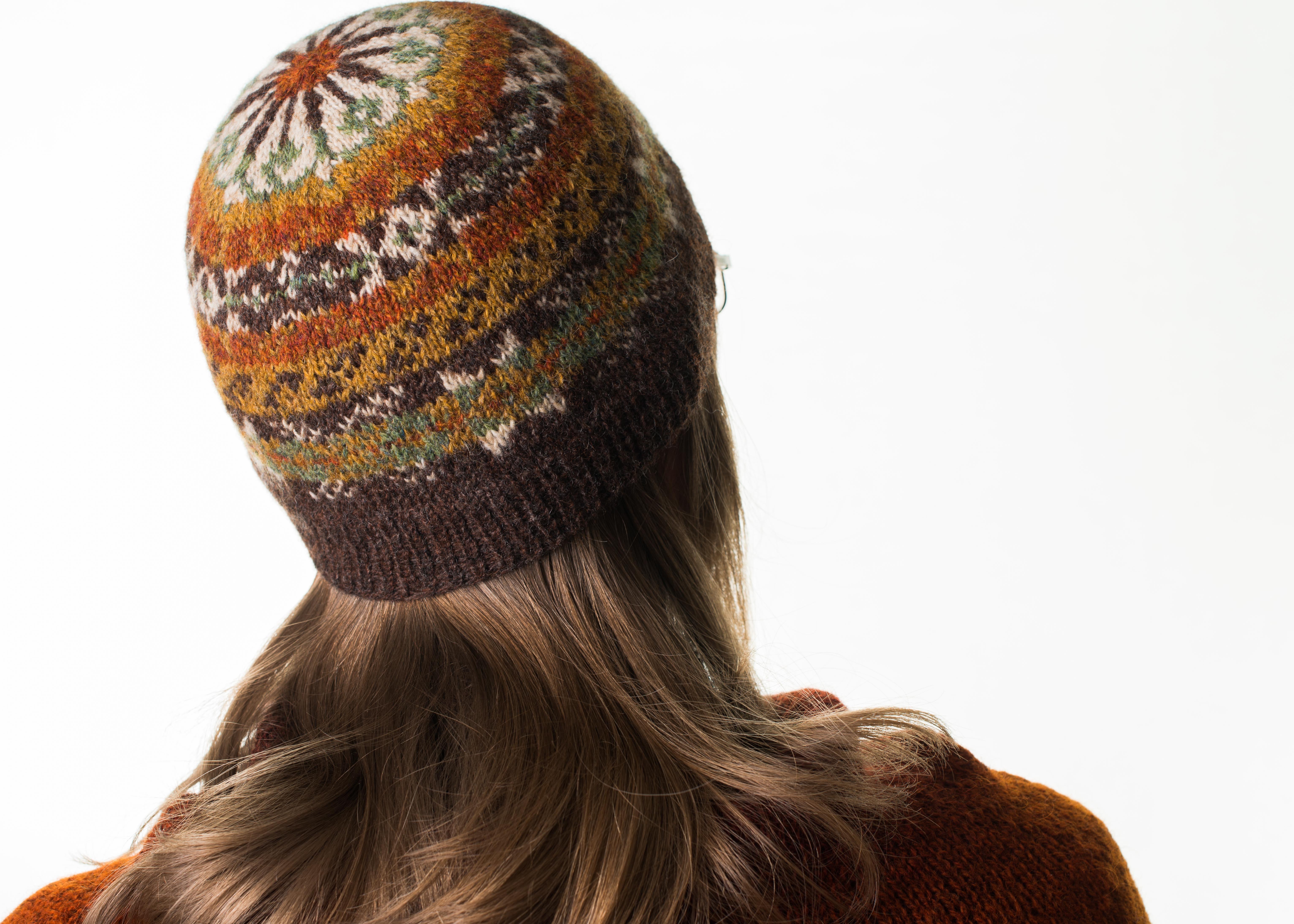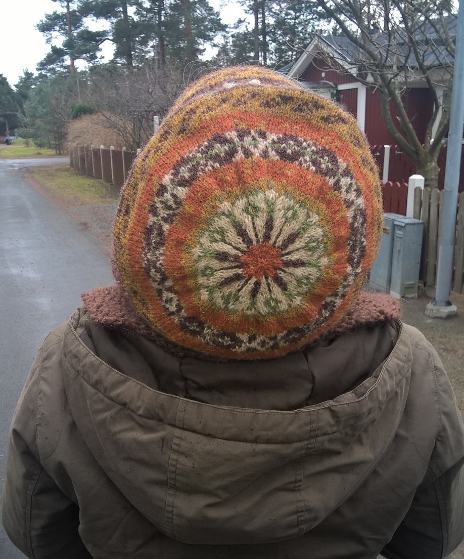 Jag gjorde sedan en till i nästan samma färgskala; jag bytte ut det orangea garnet mot ett annat eftersom jag inte hade så mycket kvar att det skulle räcka till en mössa till. Jag började sticka en medium-mössa, men kom sen på att jag ville ha den kortare och blockad som en mössa, så jag gjorde färre ökningar för att den skulle bli i storlek small. Det innebär att det är en mönsterrapport kortare och en smalare runtom, typ. Jag har lagt till ett extra varv mellan några rapporter och så är själva resårdelen ganska mycket längre än vad mönstret föreskriver.