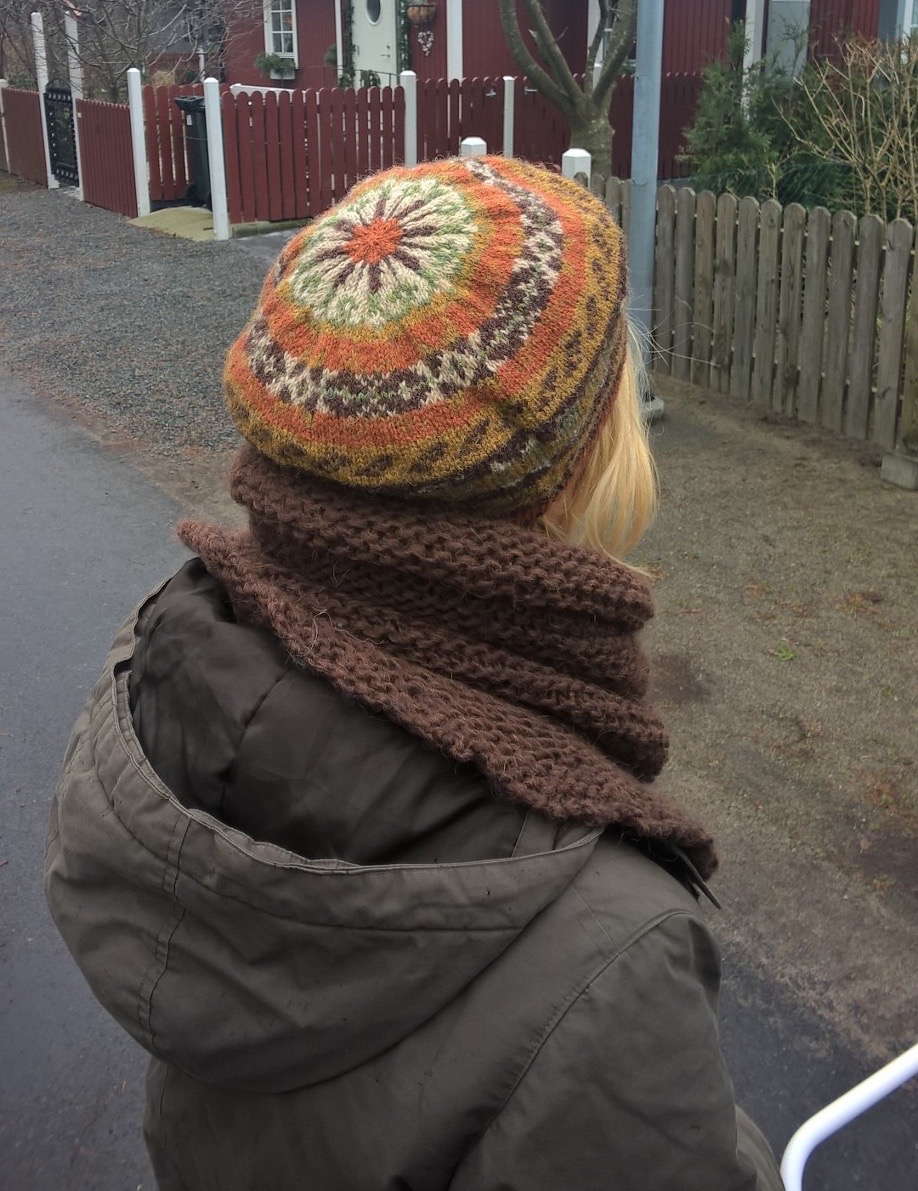 Färgvalet för egen del beror mycket på ett par fingervantar jag köpte på Shetland. De var så fantastiskt fina med bruna och orangea nyanser. De är inte stickade i samma färger eller mönster, men de passar bra ihop. Så nu finns ett matchande set inför våren och sen framåt hösten!