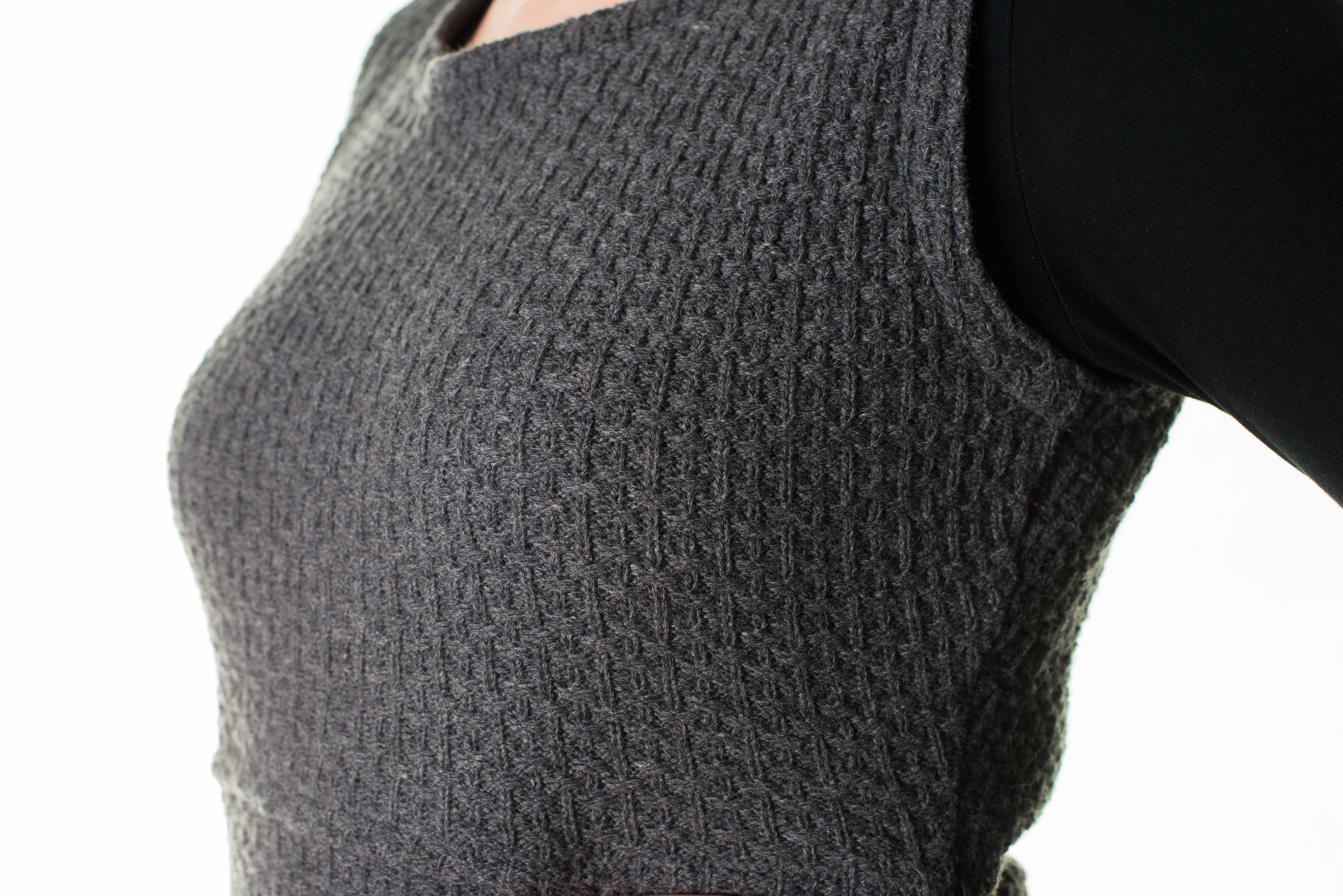 Under tidiga hösten 2015 köpte jag billigt stickat tyg från tyg.se. Det är stickat tyg av 80% ull och 20% syntet och är ganska tjockt. Jag tänkte att en klänning och en poncho skulle vara bra att ha i det här tyget. Klänningen är det som hittills har blivit till och såhär blev resultatet.